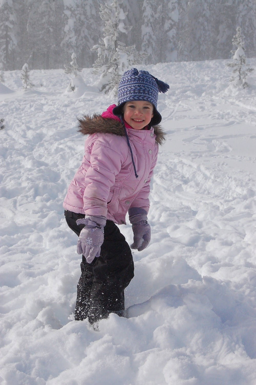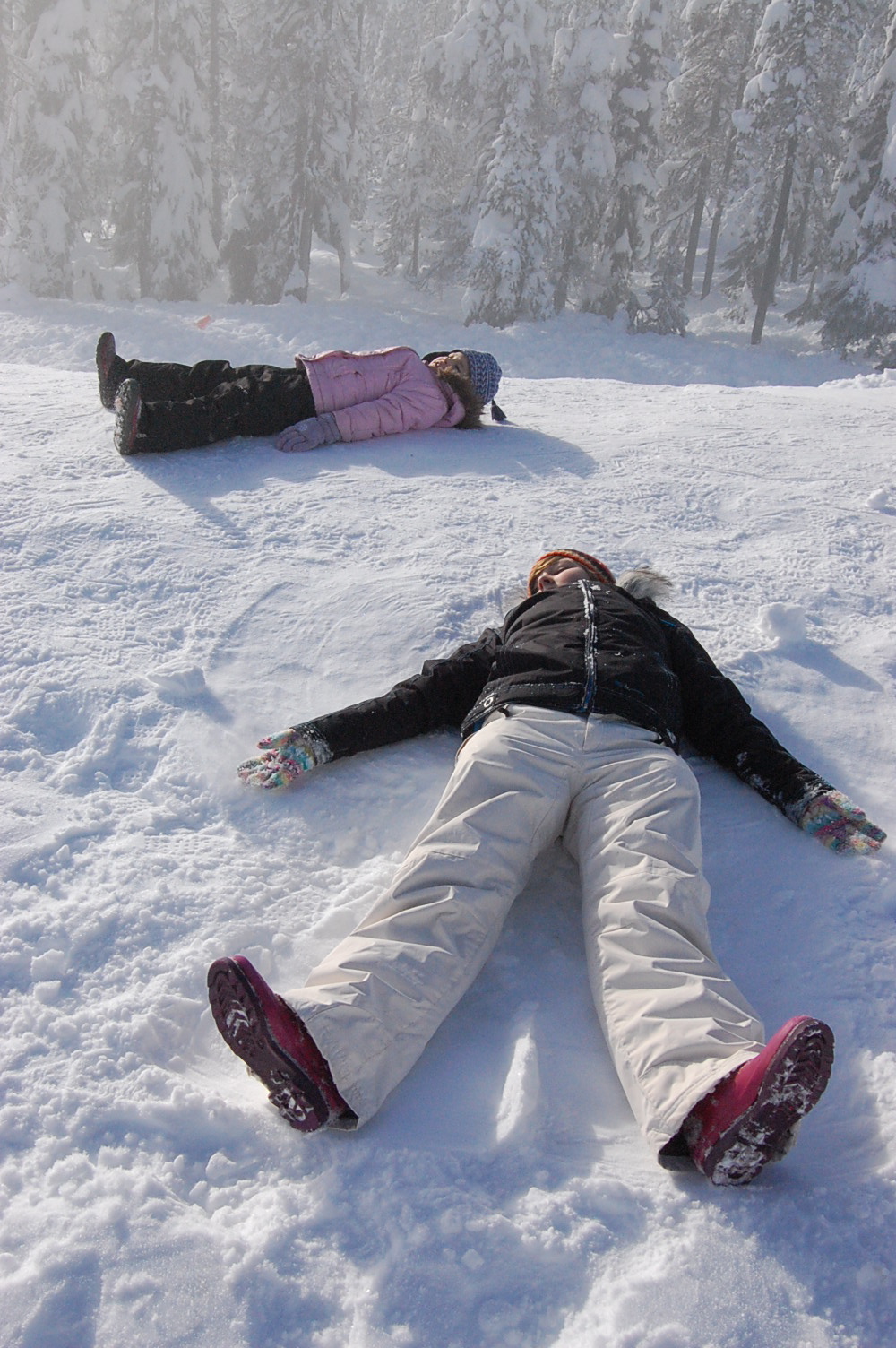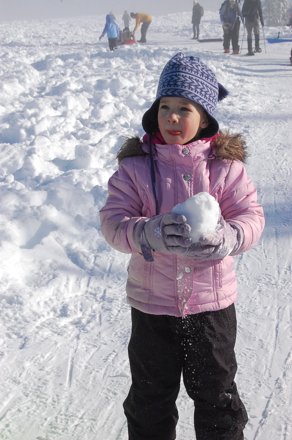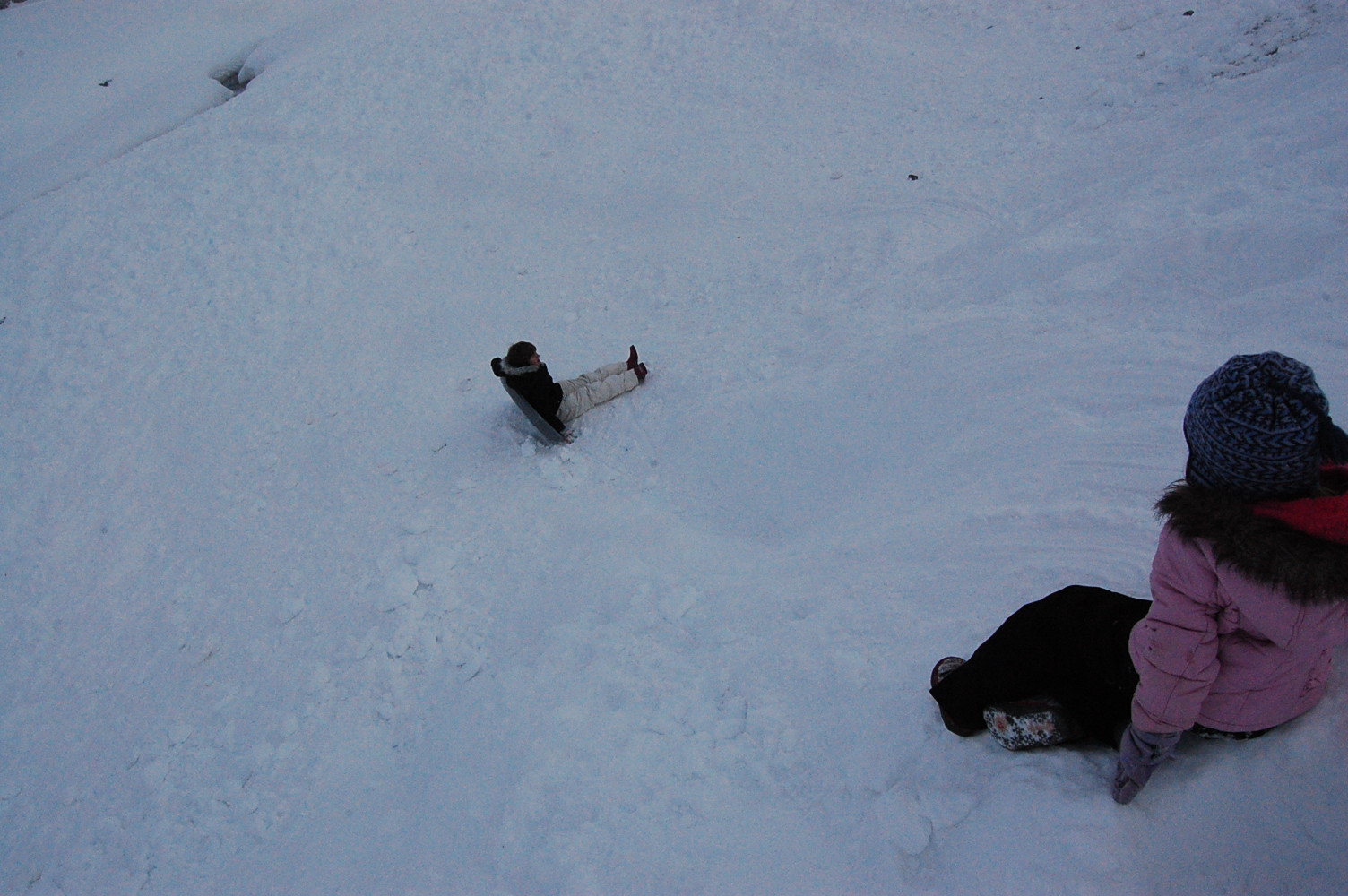Snow clothes would be dug out of a basement closet, dusted off and layered so as not to get cold and make the fun end early. White snow pants for Abigail that make her look like a seasoned snowboarder along with a fun ski hat borrowed from my collection. Anna with her black pants, that are just a little too big, and heavy duty socks to make up for rain boots that aren’t for snow but rather warm rain. She would dig for her owl hat, to keep her head and ears warm, and because it was made by her Mama.