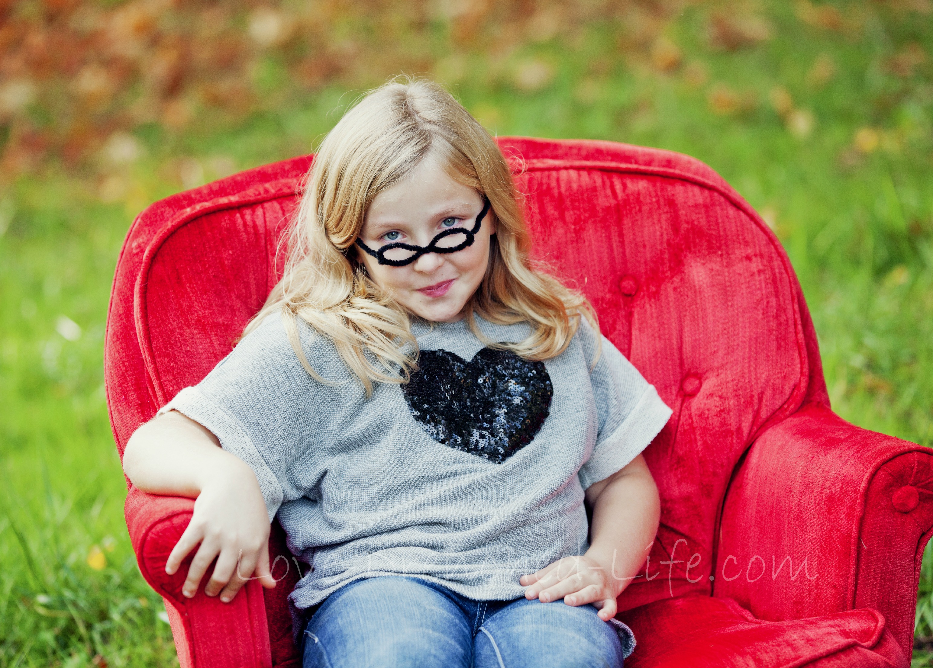 We weren’t sure where she found the pipe cleaners but while the other kids were getting their photos taken she made it into a pair of glasses. She sat down in the red chair and put them on. The photographer started taking photos.