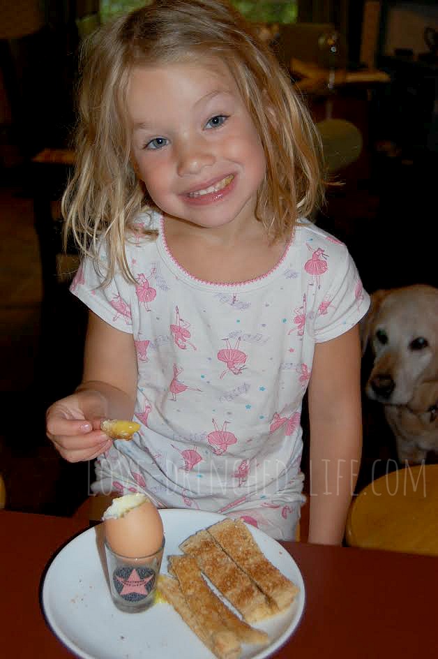 Every Wednesday morning Tom makes soldiers for breakfast ~ it is a family tradition. A soft boiled egg that is made to perfection and buttered toast cut into strips for dipping. The strips or “soliders” sit on the plate around the egg which is held into position by an egg cup, or in our house a shot glass.